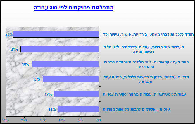להלן אפיון כמותי להתפלגות פעילות המשרד בחתכים שונים.